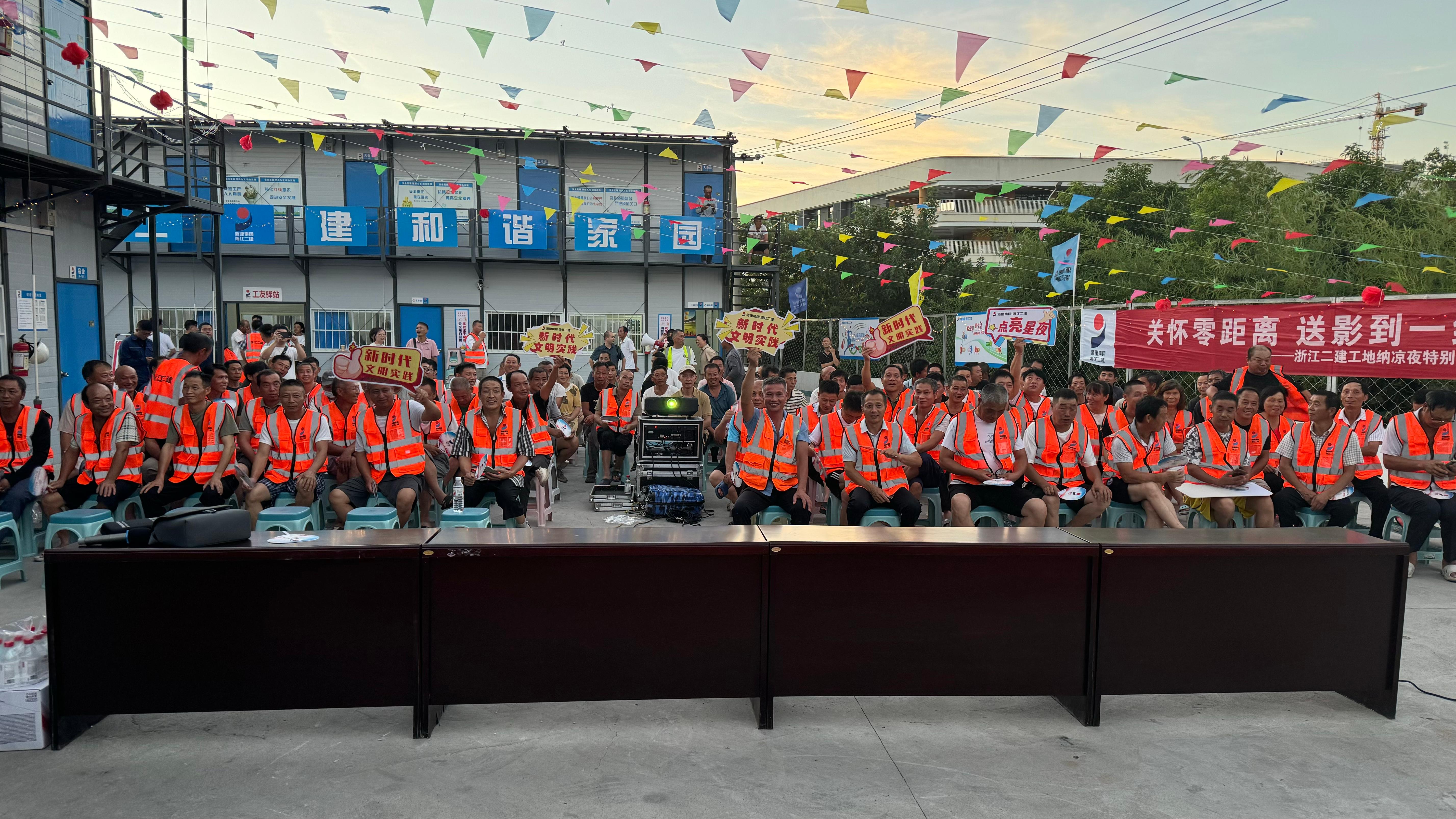 往日機器轟鳴的工地搖身一變,成為工人們消暑的納涼點。忙碌了一天的工人們早早地來到晚會現(xiàn)場,盡管工服上還帶著塵土,但難掩興奮與期待。